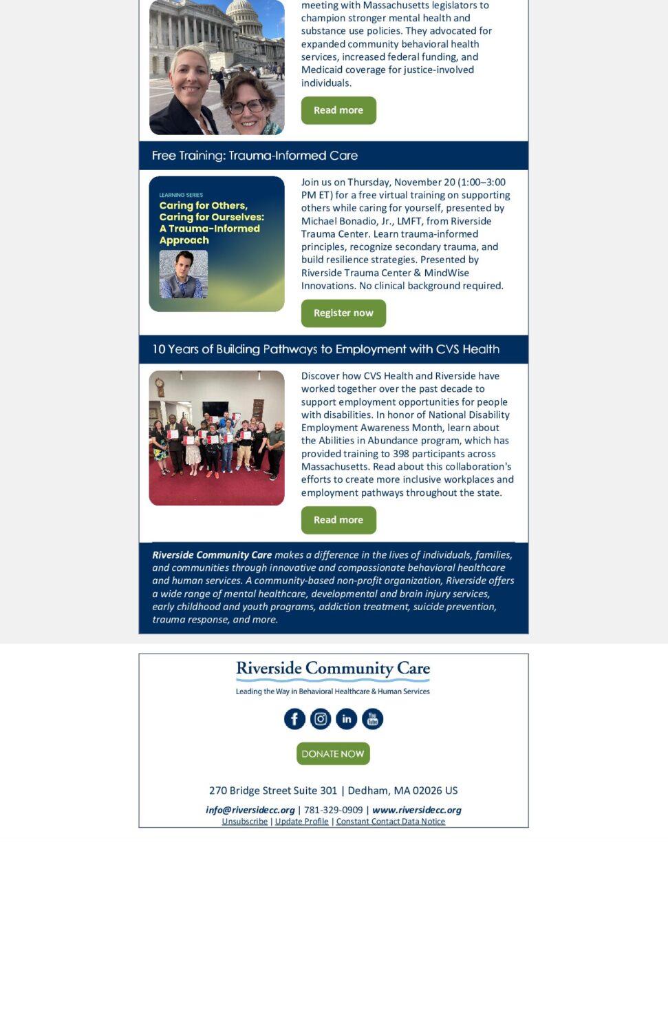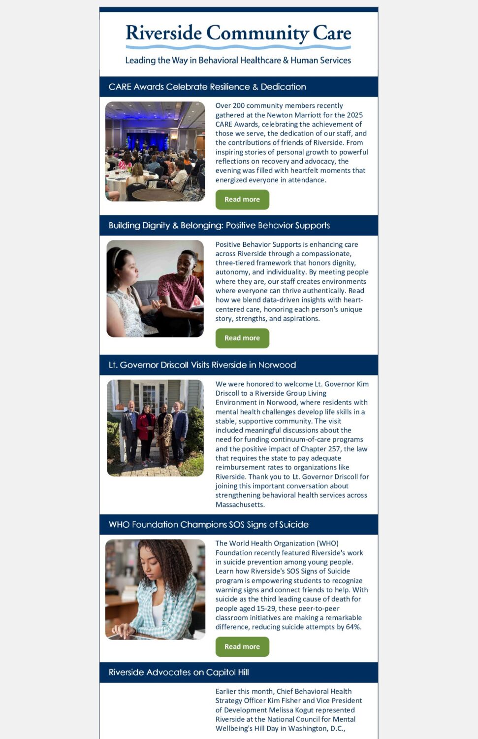 Explore Riverside’s latest newsletter for exciting updates and information about our organization! Enjoy reading about Lt. Governor Kim Driscoll’s visit to our Norwood Group Living Environment, Riverside’s advocacy efforts on Capitol Hill, the profound impact of Positive Behavior Supports, and more.
